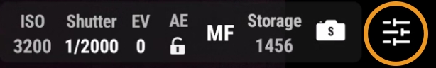 The settings bar is located at the top right of the screen. Click the settings icon on the far right side to access the camera menu.