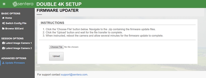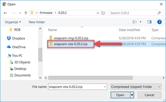 Click the Choose File Button and select the Snapcam-ota-*.zip packet provided in the updater.