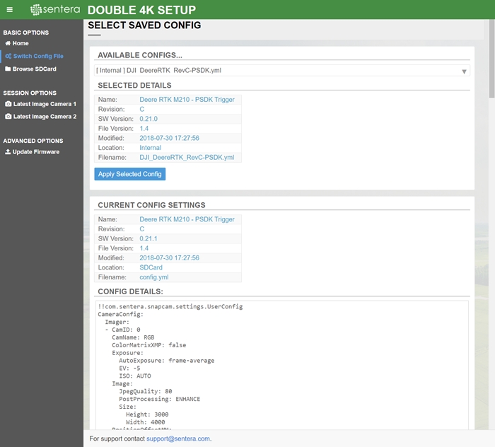 Under Switch Config File, you can change the camera configuration to pre-saved files located on either the SD card or the internal memory.