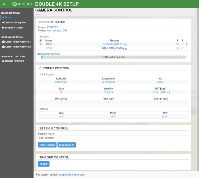 In some cases, you may want to manually trigger the camera via the web interface. This allows you to test images on the ground or in a lab environment where lack of GPS may prevent the camera from starting a recording session.