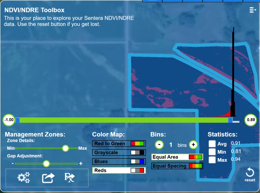 To write a prescription for only the worst or best areas of a field use the toolbox to manipulate the dataset before running the management zone tool. Isolate a specific part of the field by setting the bins to 1 and then drag the min and max sliders around on the graph.