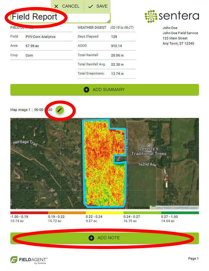 The web report displays showing default names. You can rename the report to something more appropriate to this field by clicking the edit button, as shown in the figure below. The image name can be renamed also by clicking the edit button. You can so add notes to the report by clicking the Add Note button.