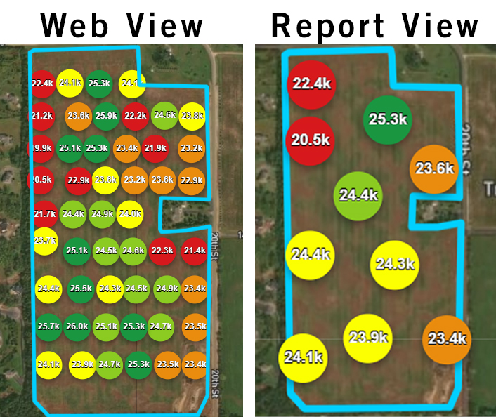 Note that the Spot Scout Map changes display between FieldAgent Web and the web report. This is to increase the readability of the data. The next section covers why and how FieldAgent Web does this.