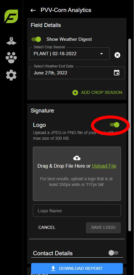 To upload a logo to brand the report, click the Logo toggle switch, as shown in the following figure.