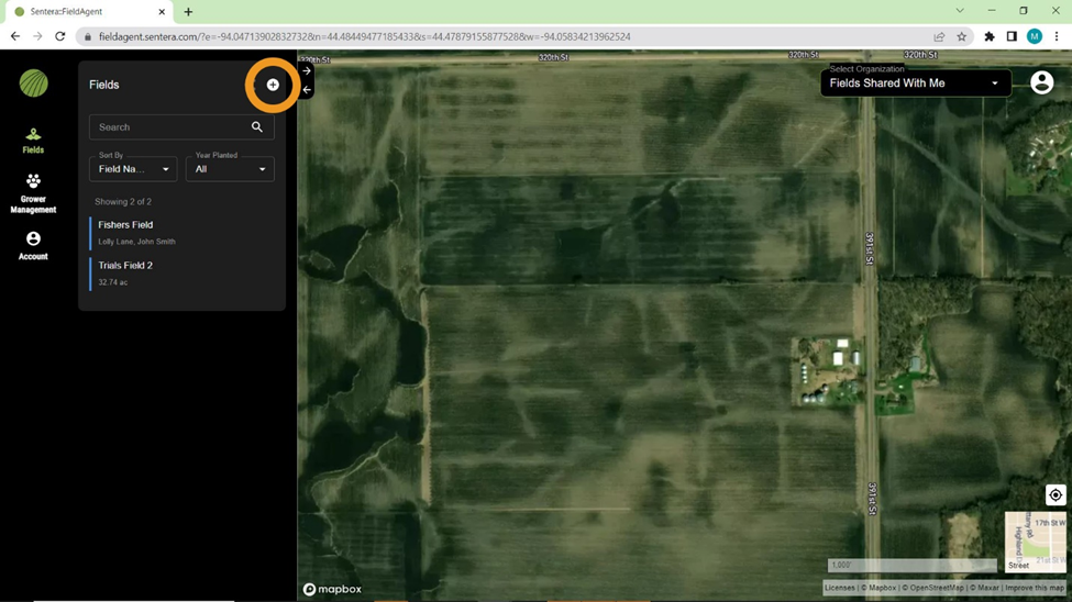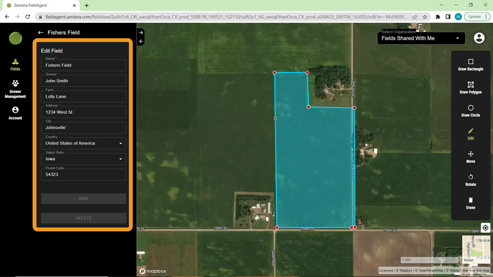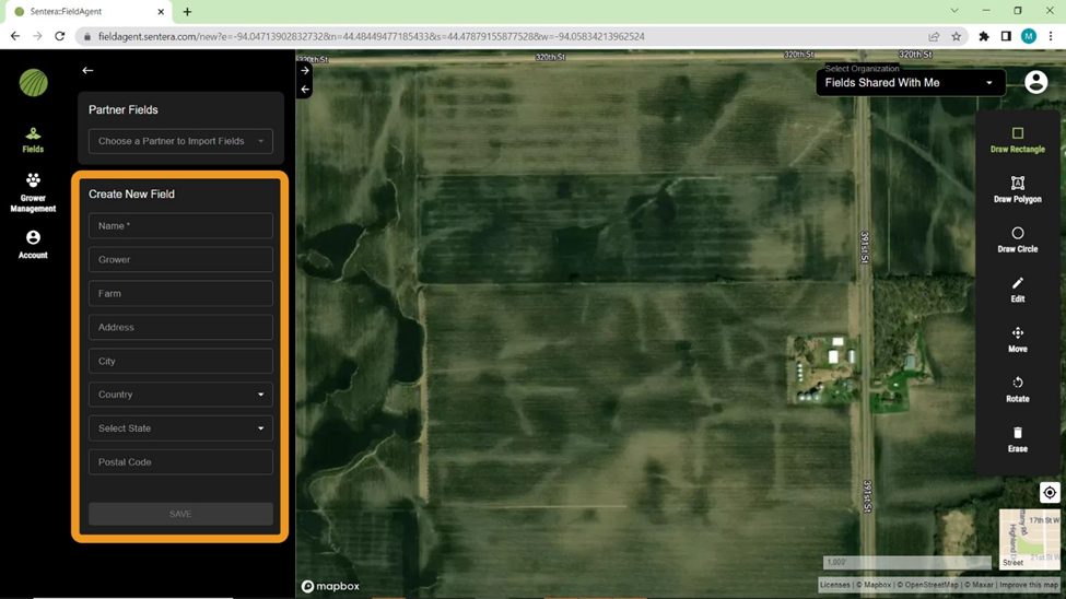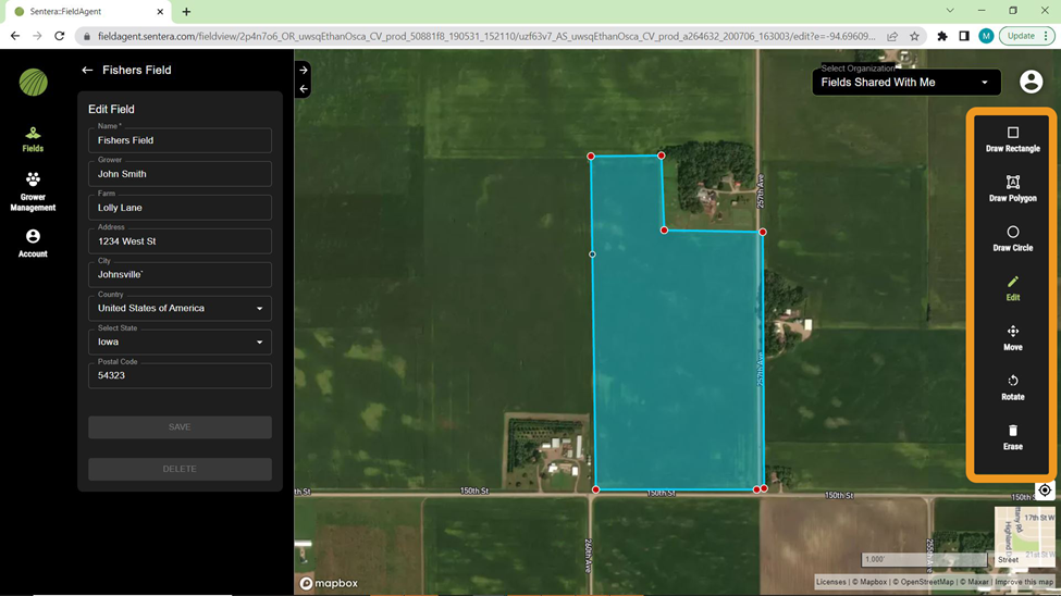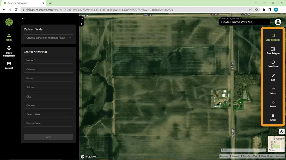 Select one of the drawing tools on the right side of the screen to create a field boundary. Draw Rectangle is selected by default. Use Draw Polygon and Draw Circle to create different shapes.