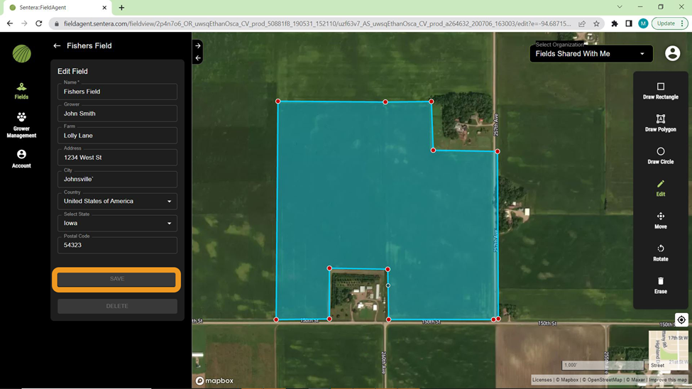 Move: The field boundary can be moved by clicking the crosshairs in the middle of the shape and dragging it.