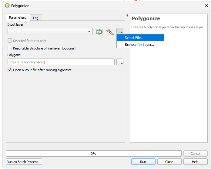 In the Processing Toolbox find "Vector Geometry" and then double click on "Polygonize".