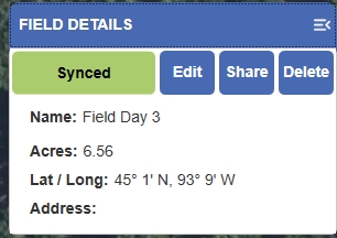 Note: If the FIELD DETAILS in the lower left does not read Synced, go back to the FieldAgent home screen and then back into the field. Click the cloud button on more time until Field Details reads Synced.