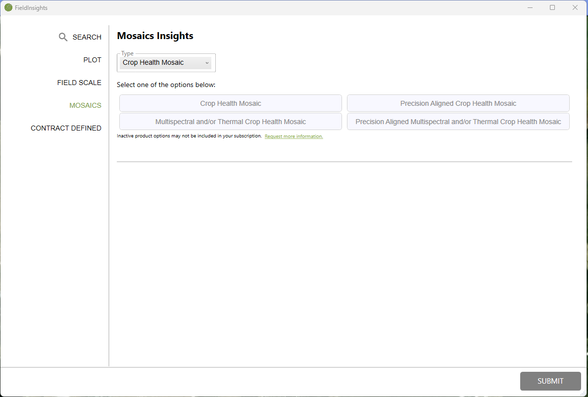 Select Mosaics and then click on the dropdown and select Crop Health Mosaic, then select "Multispectral and/or Thermal Crop Health Mosaic", and then click Submit.