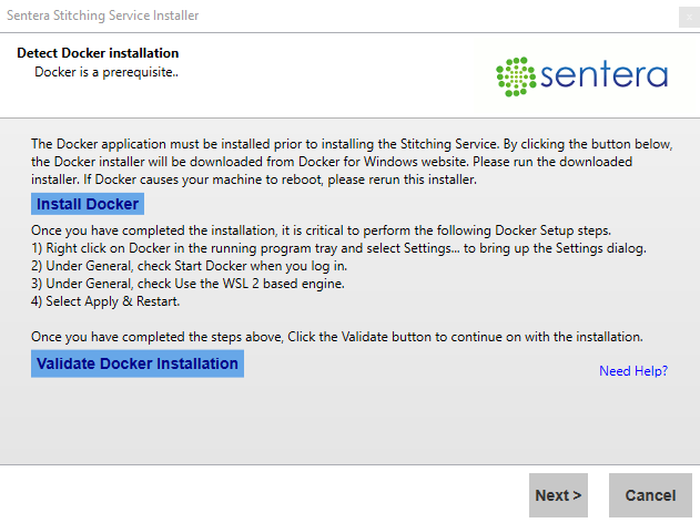 Return to the Sentera Stitching Service Installer, and click "Validate Docker Installation".