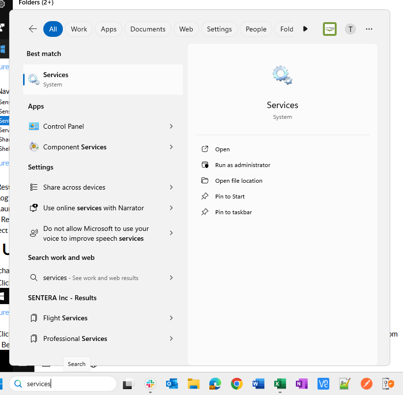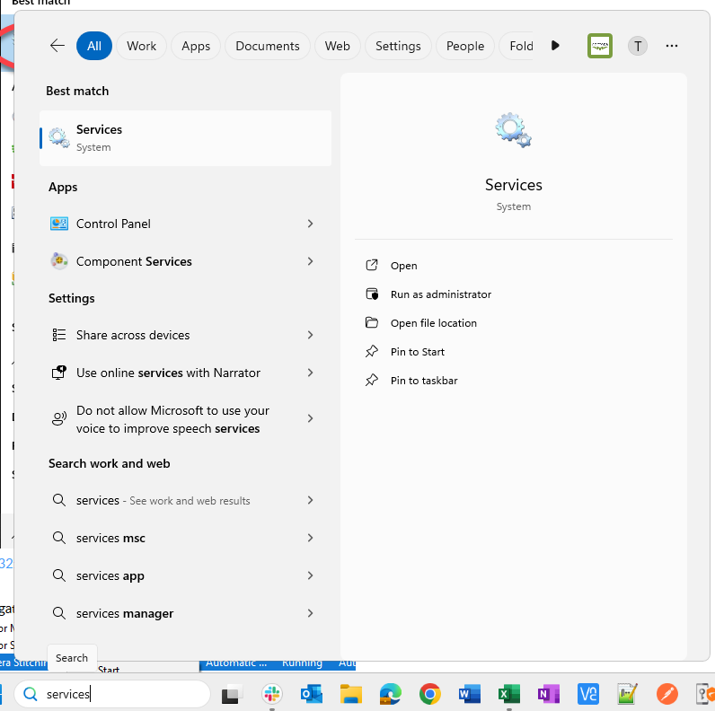 Click the Search icon in the bottom left center of the taskbar and type Services into the search box and select Services from the Best Match item list, as shown in Figure 32.