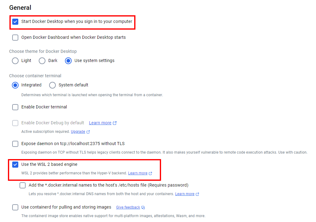 15. Change the settings to match what is shown in figure 15, i.e., check " Start Docker Desktop when you sign in to your computer" and "Use the WSL 2 Based engine" and click button "Apply & restart".