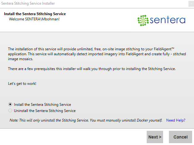 The purpose of this document is to guide a FieldAgent user through the download and installation of the Sentera Stitching Service. If you have any issues, contact Support at Sentera.