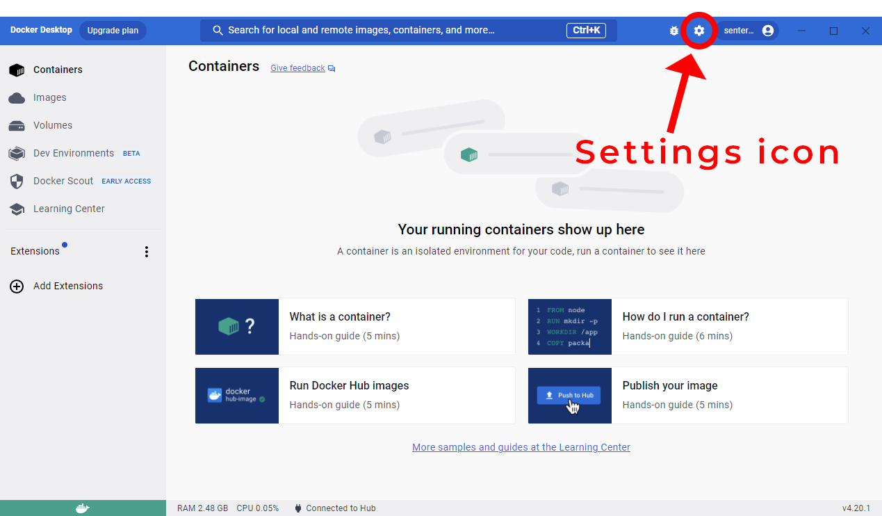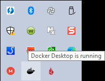 Wait until Docker restarts and displays the message “Docker Desktop is running,” which will display in the hidden Icons menu on the windows task bar.