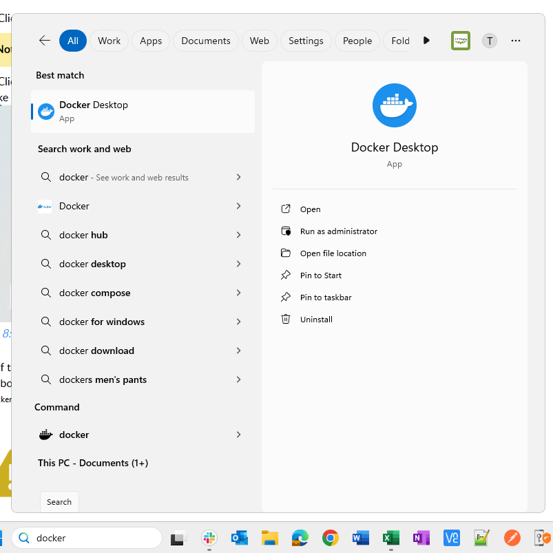 Click on search in the lower center of the screen (when using windows 11) and type in Docker, select Docker as shown in Figure 8. It will take a few minutes to launch.