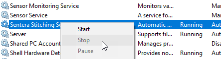 Repeat Step 6 to navigate the Services to determine if Sentera Stitching Services is running. If not, then right-click, and select Start.