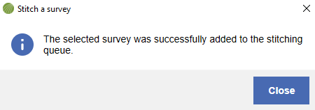 The survey chosen to stitch displays in the stitching queue. View the queue by clicking on the stitching Icon on the top right of the screen.