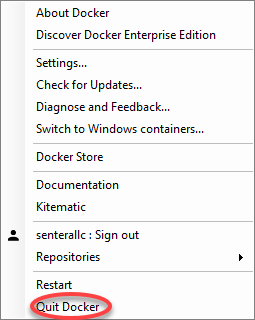 Right-click on the Docker icon and select Quit Docker, as shown in Figure 31.