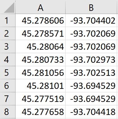 Your CSV file must include two columns. Latitude values go into column A, and Longitude values go into column B.