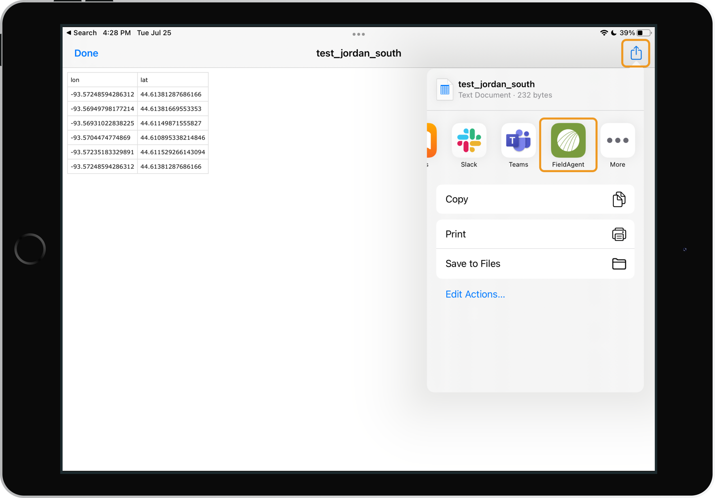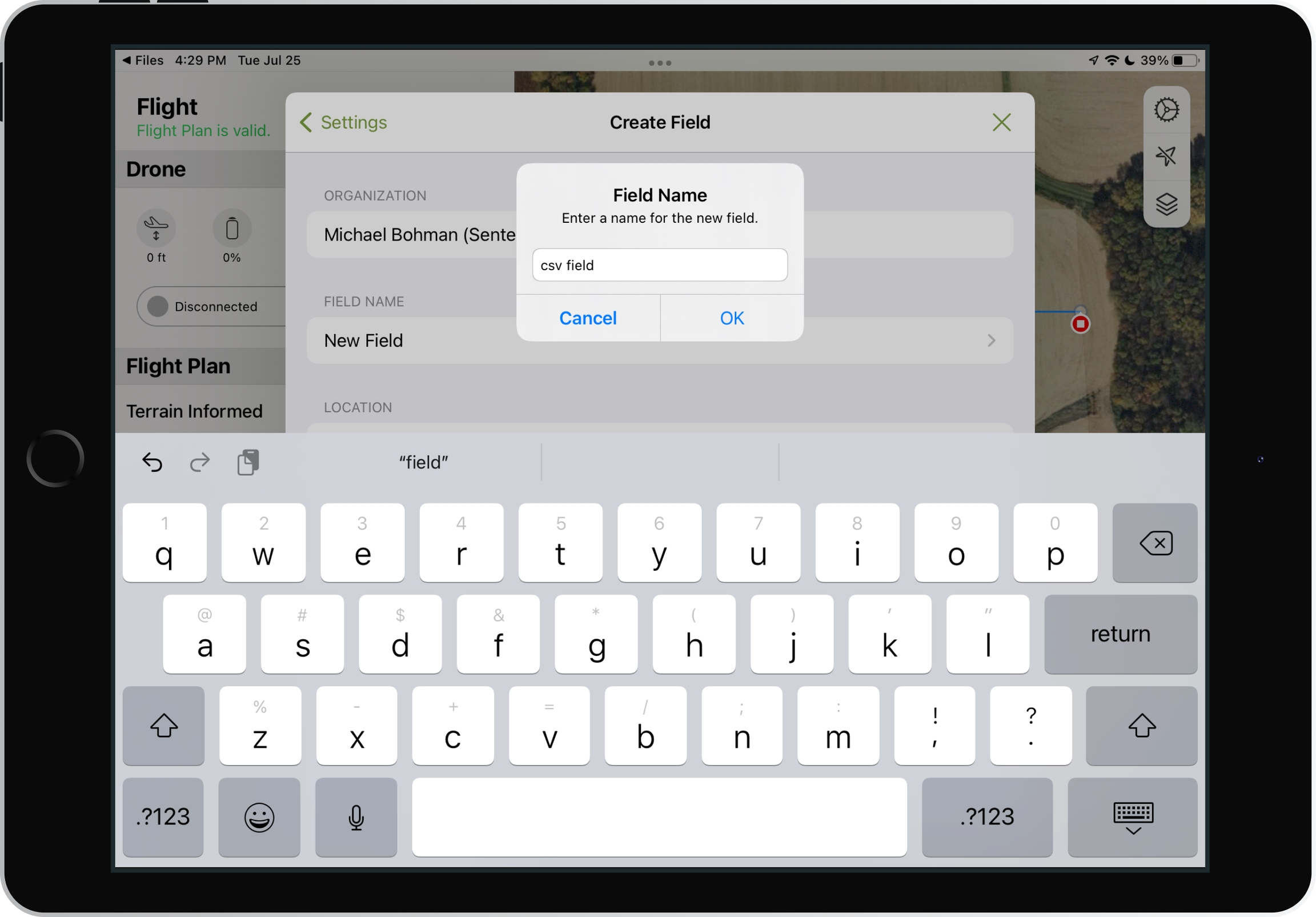 CSV Files can be imported into FieldAgent Mobile by choosing to open the file with “FieldAgent” on you iPad. These CSV Files of GPS points can be used to create a Flight Plan and or even a new Field.