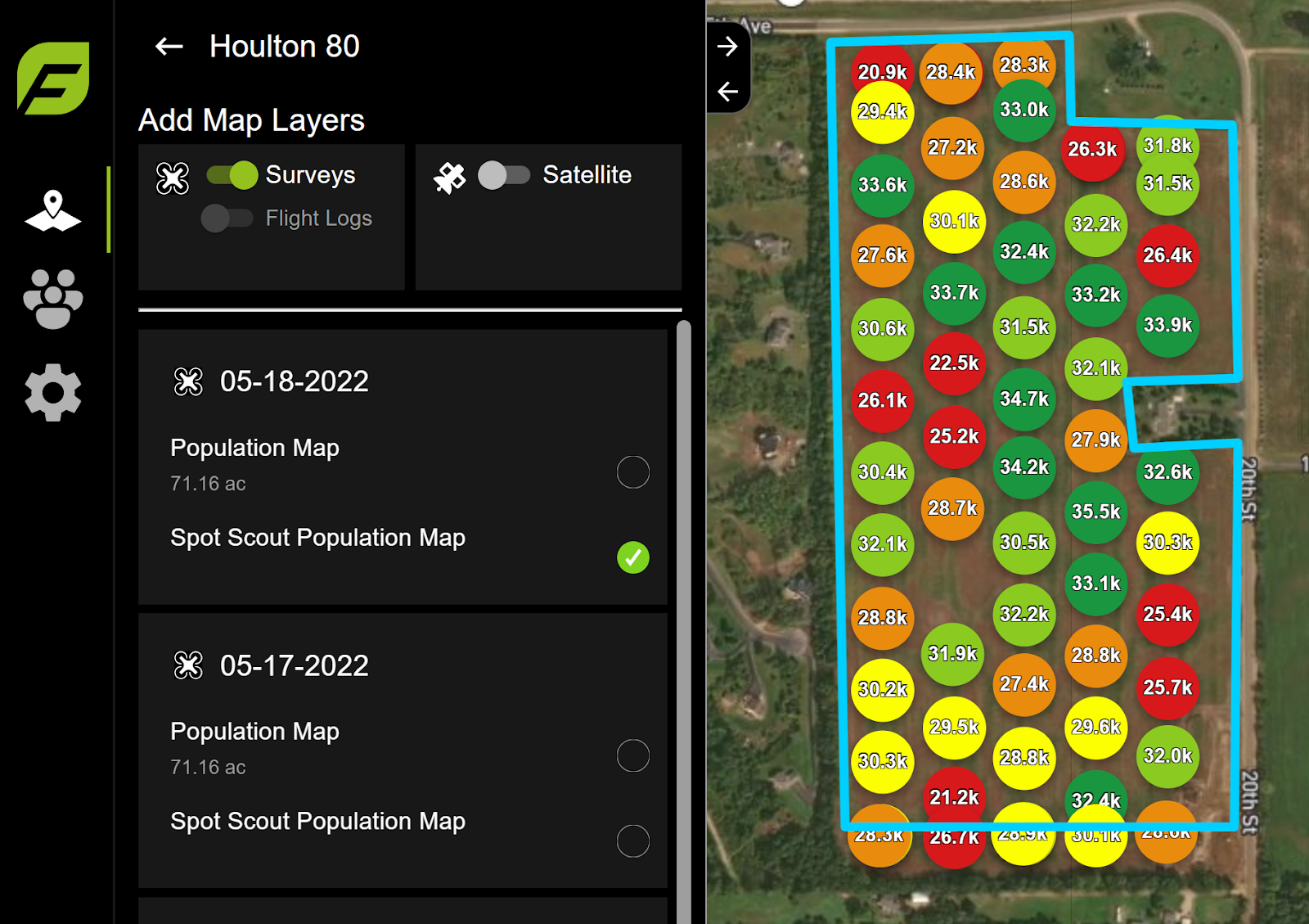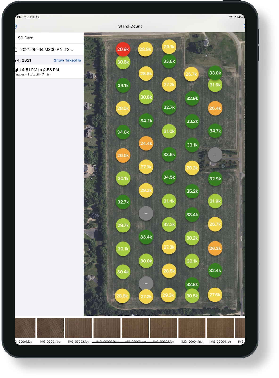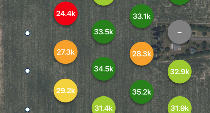 Each Stand Count disc displays the detected number of plants per acre and is colored according to how that number compares to the other Stand Counts on the screen. Dark green indicates a higher Stand Count, red indicates a lower Stand Count.