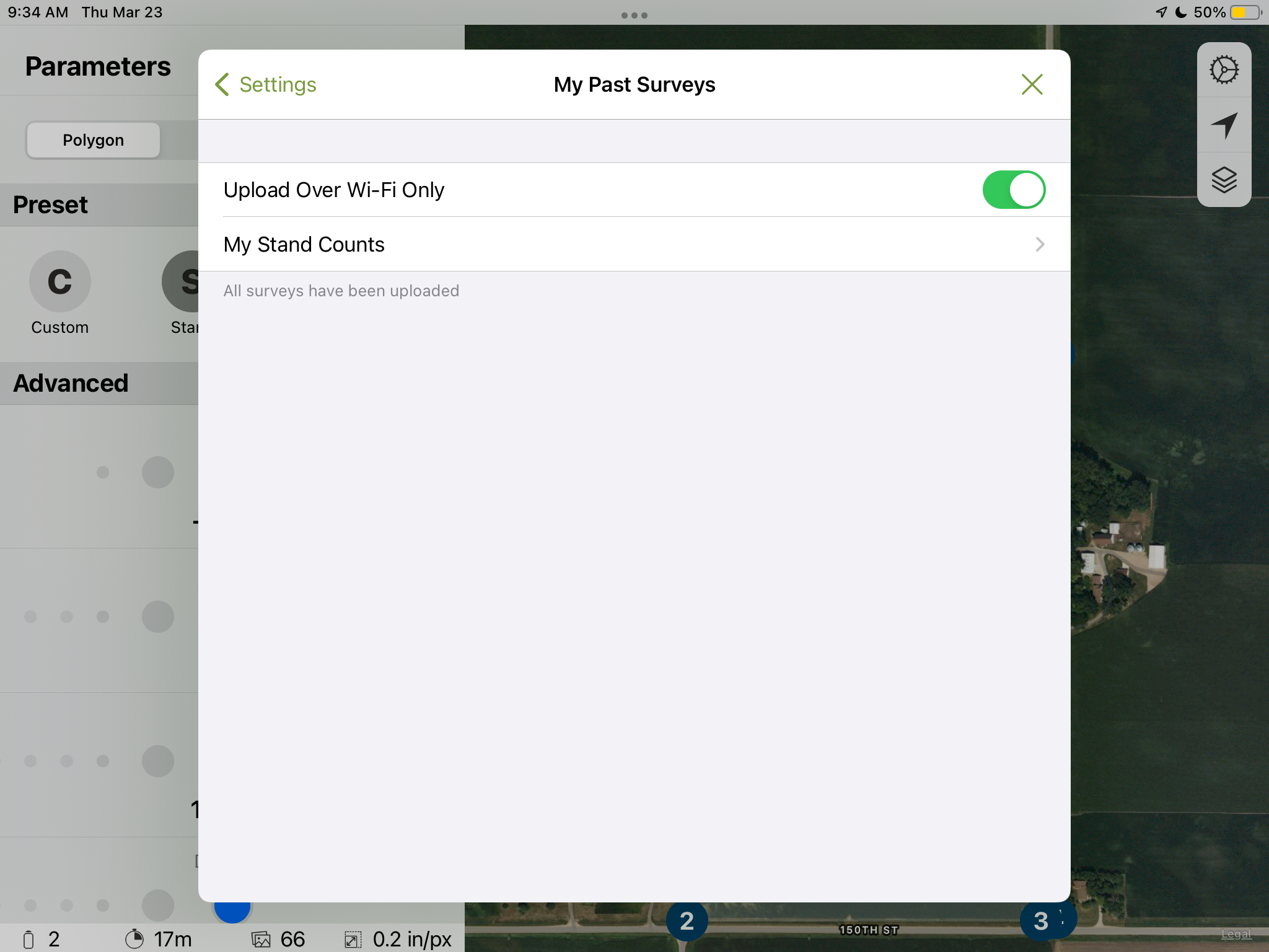 The iPad that is generating Mobile Stand Counts must be connected to the internet in order for Stand Count results to be uploaded to the cloud and accessible on the Web and Desktop. A field must also be selected when running Stand Counts so that the Stand Counts have somewhere to upload. File sizes on Stand Counts are designed to be extremely small, so as not to interfere with low data caps or connections in areas with slow connectivity.