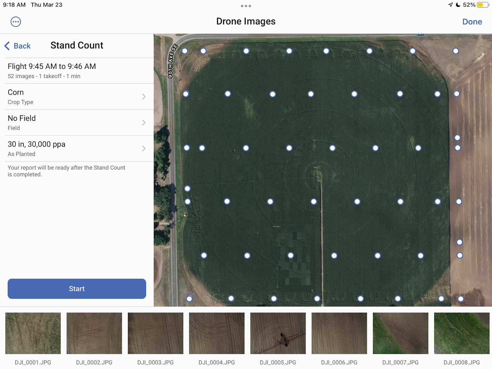 The boundary buffer for Stand Counts is set to 100ft. This will cause Stand Counts over small fields (less than 50 acres) to have much less than one Stand Count per acre. Lowering the boundary buffer (as it is safe to do so) will allow the drone to fly closer to the edges of the field and thus capture more of the field.