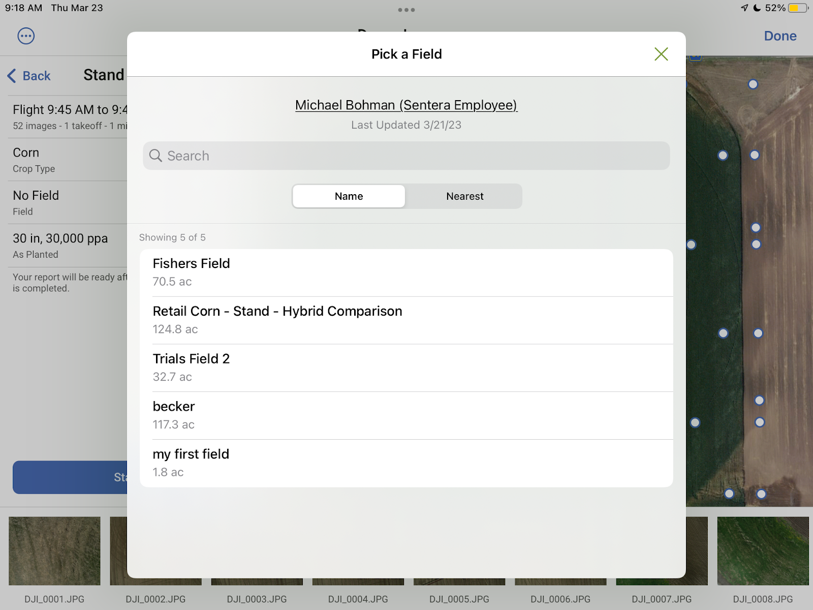 Uploading results to the cloud requires a field selection. Click Field and choose from your list of fields. You may need to switch organizations to find an existing field.