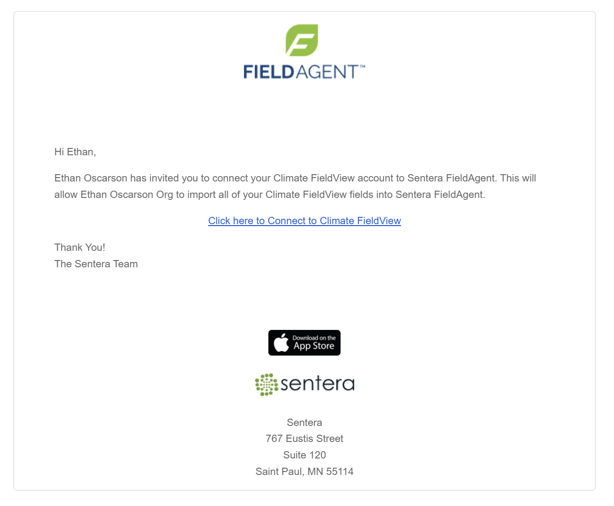 The connection email looks like the email below. Once the grower clicks the link in the connection email, enters their user name and password, and clicks Allow, all of their fields will be imported into FieldAgent under the organization you created.