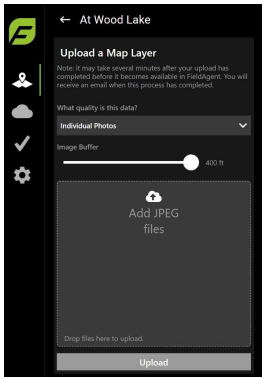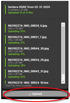 Click Upload in the bottom left menu, as shown in Figure 30. The images will start to upload to FieldAgent Web App.