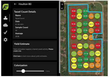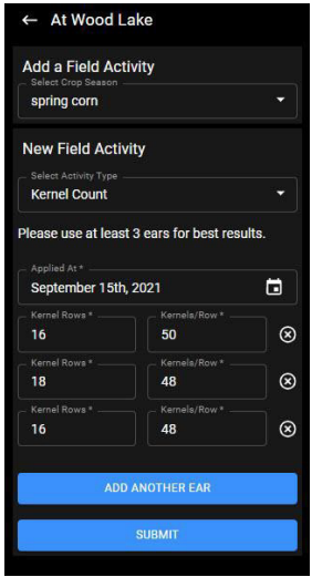 The user can enter kernel counts which is used to calculate bushels per acre yield estimate for the field.