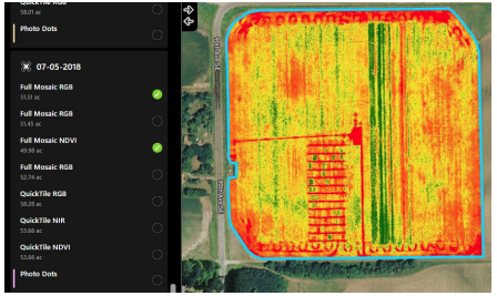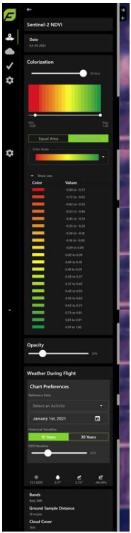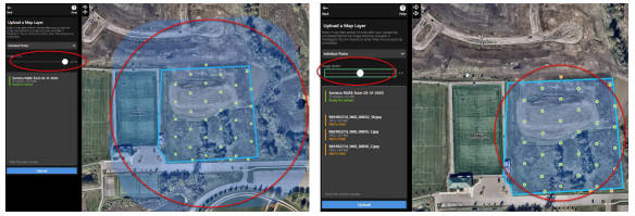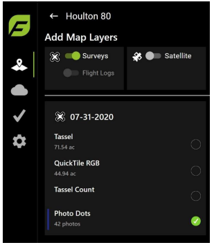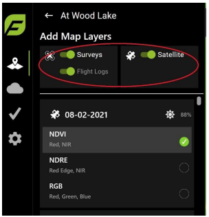 Select the Surveys, Satellite, and/or Flight Logs icon(s) to view the map layers, as shown in Figure 37. The Surveys icon displays images captured by the drone, the Satellite icon displays the satellite imagery, and the Flight Logs icon displays the flight paths flown.