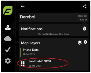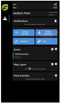 Based on your Field Activity details such as entering planting data, FieldAgent displays Notifications to help prepare, prevent, and understand potential hazards for the field. A notifications indicator will appear next to the field name, as shown in Figure 33. Notifications alert to events such as plant stress or hail damage, allowing you to gather information for insurance purposes or plan a drone flight.