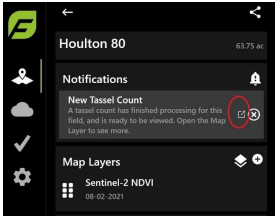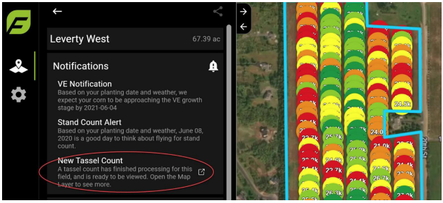 After the field was flown and processed for a tassel count, a notification displays that a new tassel count is available for viewing, as shown in Figure 67.