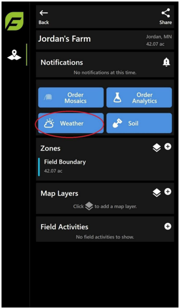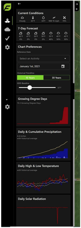 The FieldAgent Web App can provide current, forecasted, and past weather data on each field.