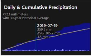 Move the mouse across the chart to display the Date, Cumulative, Average Cumulative, and Daily Precipitation for the field, as shown in Figure 85. The white line in the following graph shows the 30 Year historical average of precipitation for the location.