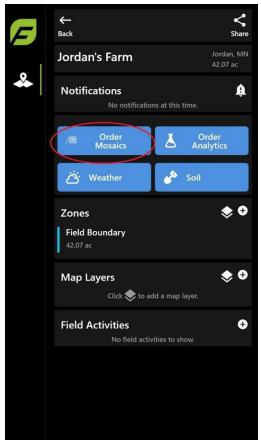 Note: Once you import imagery to a field that is not in your home organization, but it is in a partner organization or another part of the hierarchy, you can share the field to yourself, which enables you to see mosaics and tassel counts ordered and produce PDF reports.