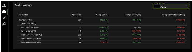 FieldAgent provides aggregation weather data of field, region, country, and overall of Growing Degree Days, Rainfall, and Solar Radiation. Click the cloud icon from the left-hand side of the window, as shown in Figure 80.