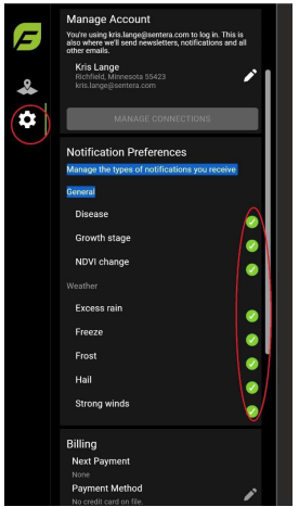 To turn off and on disease, weather, field, NDVI, growth stage, and other notifications within FieldAgent Web: