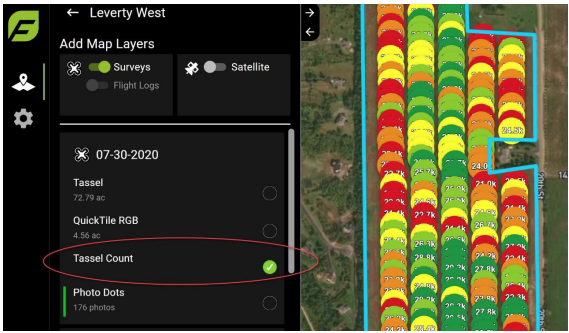 From the Add Map Layers area, scroll to the date of the survey and then select the Tassel Count analytic, as shown in Figure 70.