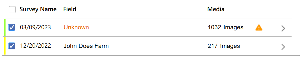 If you do not have a field boundary for your image survey, FieldAgent will begin to create one for you. New fields will show up with a field name of UNKOWN and will have a yellow warning icon.