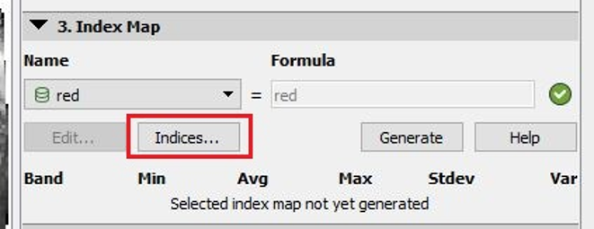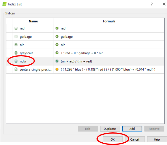 2. Check to see if the NDVI and NDRE indices are present in the dropdown. If missing, click Indices and continue to Step 3.