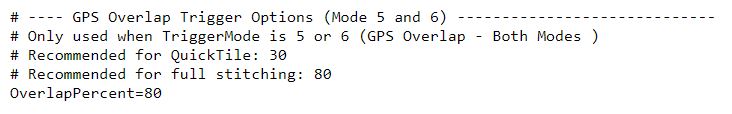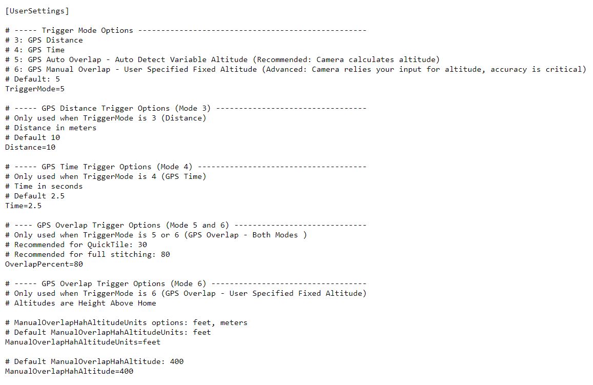 There are 4 different modes for trigger conditions, based on overlap, altitude, distance and time values. You can switch between these modes by editing a text file on the sensor's SD card. We will cover how to do that later in this article.