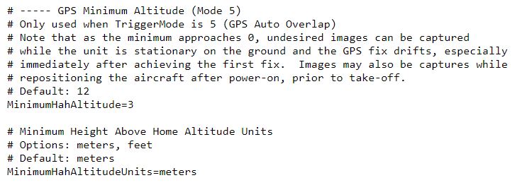 * **Minimum Height:**  When the sensor is below the minimum height, it will not capture images. The sensor's height is determined by its distance above the home location. A low minimum height value helps reduce the amount of unwanted images taken on the ground and in transit, but it can prevent low altitude image capture.  The Default Value is 12 Meters. You can change this value to be between 0 and 200 meters. Note that very low altitude flights may produce images that are out of focus.&#x20;